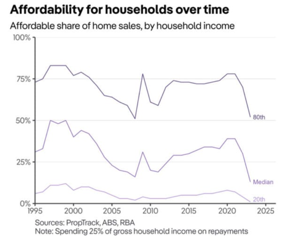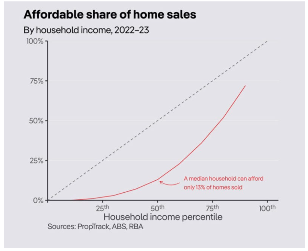 The data shows that a household earning the median (or typical) income of just over $105,000 per year in Australia can now afford loan repayments on just 13% of properties sold across the country over the past year.