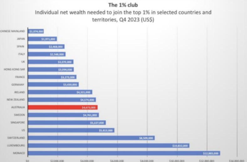 Australia sits ahead of New Zealand, where US$4.574 million is required to enter the 1% club, but behind the likes of Monaco, which sits in top position, with US$12.883 million required to enter the top 1%.