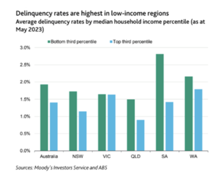 Moody's analysts Alena Chen and Philip Au noted mortgage delinquencies have risen in every state and territory of Australia, with lower-income areas, particularly in outer-suburban areas, bearing the brunt of interest rate hikes and inflation.