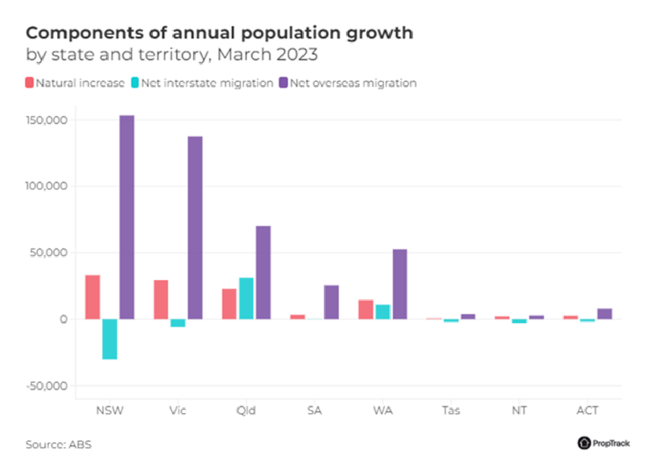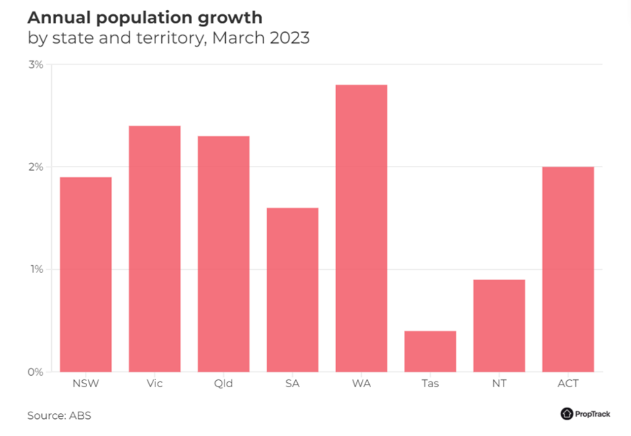 According to a recent PropTrack report, in the 2022 calendar year, the population grew by 2.02%, with the majority of that growth driven by record net migration in excess of 400,000 persons.
