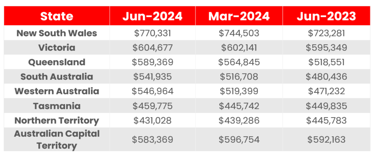 Without a doubt, the average loan amount has increased in most states, as per Figure 3. The exception is the Northern Territory (NT) and Australian Capital Territory (ACT). We are all serving bigger debts, with 48.1% (as of June quarter 2024) of the Australian median family income spent to meet average loan repayments. This is an increase from 45.5% the year prior. Those in New South Wales are the hardest hit, with 57.9% of the median family income spent on meeting monthly average loan repayments. Consistent with Figure 3, NT and ACT have the lowest percentage, of 32.4% and 33.3% respectively.