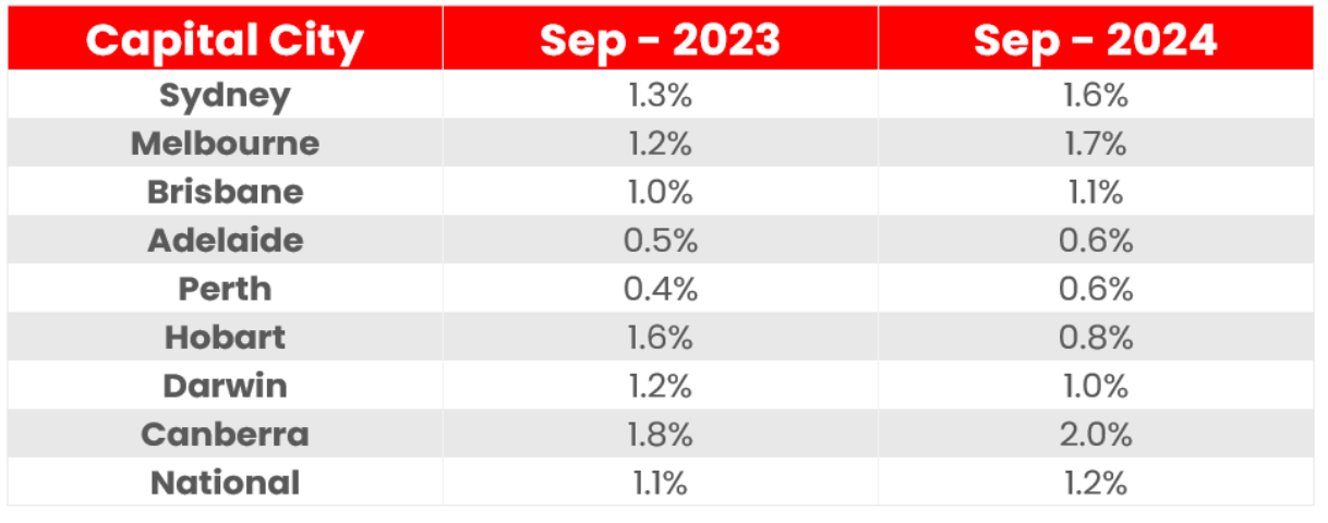As of September 2024, the national vacancy rate was 1.2%, a slight increase from 1.1% the year prior. Most capital cities have seen slight increases, except for Hobart and Darwin (see Figure 4). However, these are only minor, with the vacancy rate all sitting below the Real Estate Institute of Australia's healthy benchmark of 3.0%. Meaning, as investors, we are still in the "safe zone".