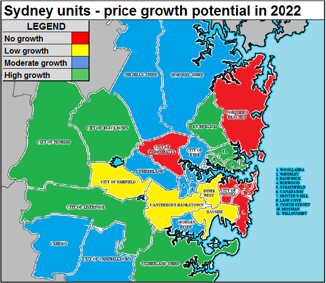 We’ve produced some heat maps using our patented Housing Market Prediction Solution to compare the forecast growth potential in Sydney Local Government Areas for houses and units during the next twelve months.