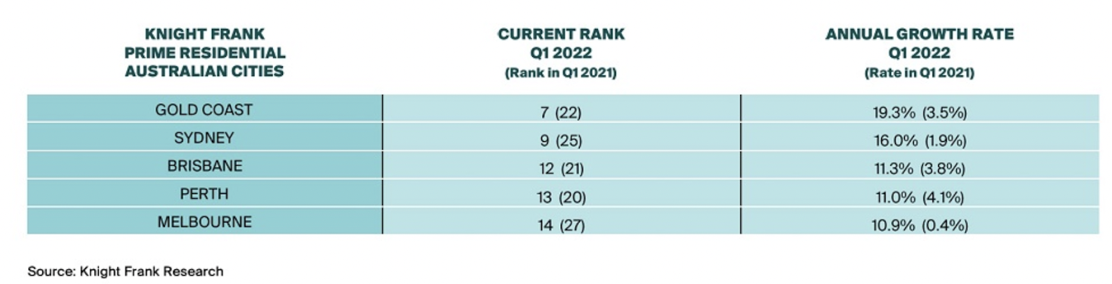International property consultancy Knight Frank’s Prime Global Cities Index Q1 2022, crowned the Gold Coast as Australia’s top-ranking prime property market thanks to robust property price growth.