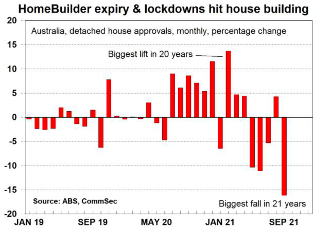 Sure approvals to build detached houses dropped 16.1% in September, the biggest monthly decline in 21 years, but this is not unexpected on the back of unwinding the homebuilder stimulus related housing activity and the Delta virus lockdown disruptions.