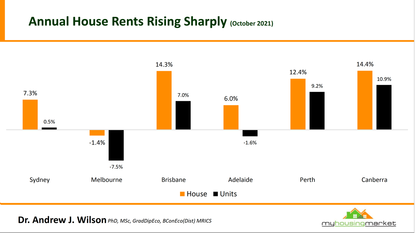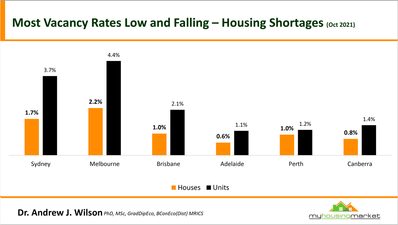 There is a chronic rental shortage emerging as rentals surge as vacancy rates, particularly for houses, are low and still falling.