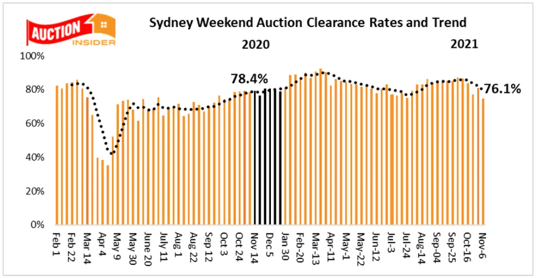 Sydney recorded a clearance rate of 76.1% at the weekend which was well below the previous weekend’s 81% and also now remarkably below the 78.4% recorded over the same weekend last year.