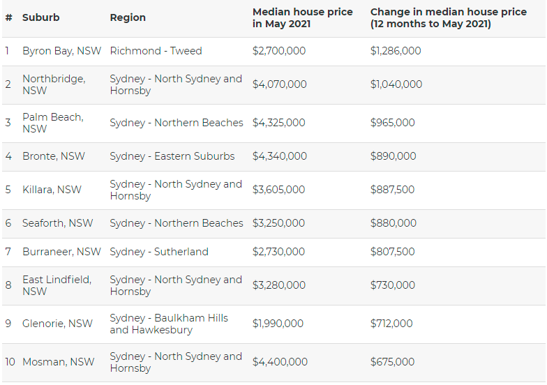 Palm Beach, Bronte and Killara made up the remainder of the top 5 with median property price increases in the realm of $965,000, $890,000 and $887,500 respectively.