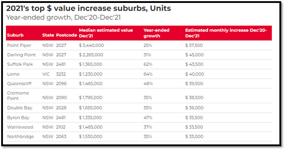 “That’s no surprise given house prices have surged Australia-wide, meaning higher value suburbs will see the dollar value of prices increasing the most,” Ms Creagh said.