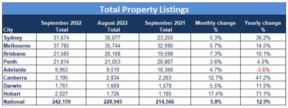 Figures from SQM Research showed a 5.8% increase in residential property listings in September to 242,159, up from 228,945 recorded in August.