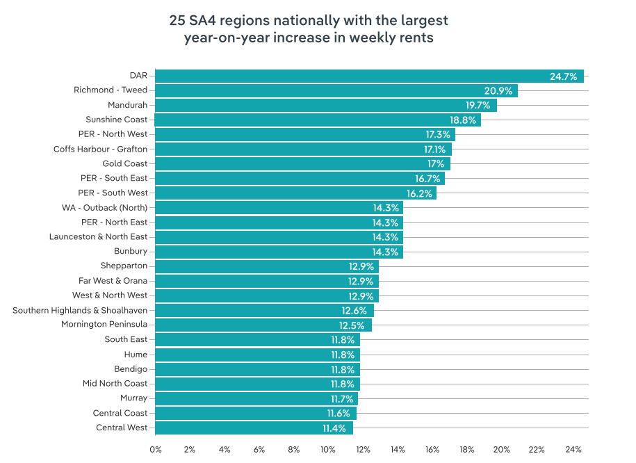 Richmond-Tweed, Mandurah, Sunshine Coast, and Perth-North West also witnessed significant rent increases over the past year.