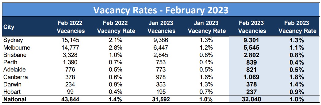 Canberra, Hobart, and Darwin witnessed increases in vacancy levels in the month, while the national figure remained steady at 1%.