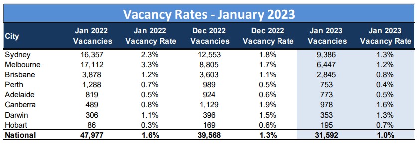 Australia’s rental markets are poised to have its tightest conditions over the next two months, after vacancy rates retreated in January after the seasonal rise in the last month of 2022.