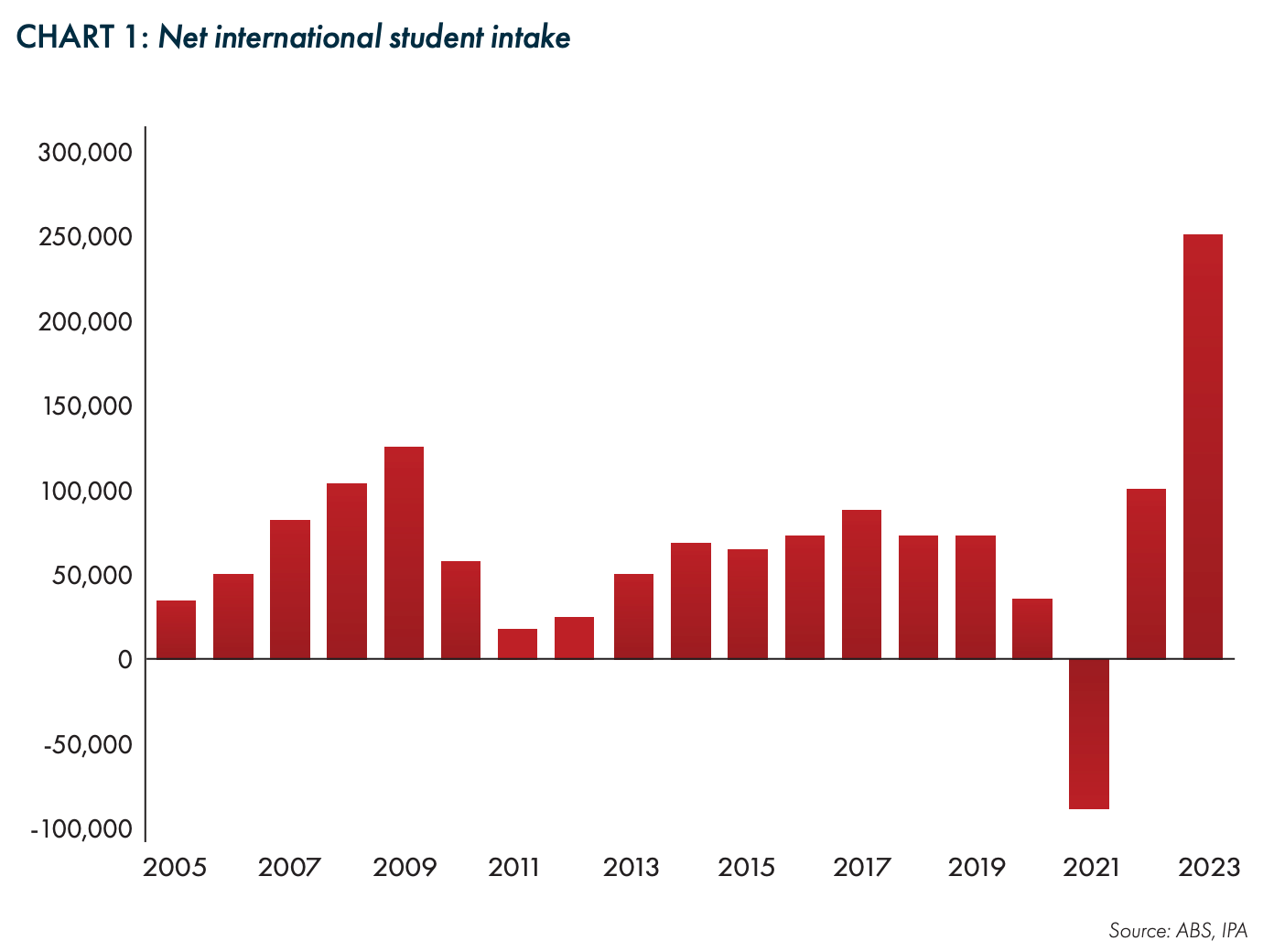 According to the Institute of Public Affairs (IPA), in the last financial year the federal government oversaw the largest ever net intake of international students, more than 250,000 students which doubled the previous record high of 122,000 in the financial year ending 2009.